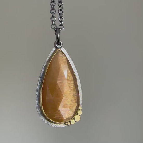 The magic sheen of this African lattice moonstone is just phenomenal! As light interacts with the internal structures of the stone the iridescence and shimmer is otherworldly. It is a glittery or spangled effect that adds a warm, colorful dimension. The rose cut on this gem results in a lot of brilliance. I set this beauty in 22K gold bezel with 18K gold accents. The back of the stone is open. Pendant measures 1 1/4 x 3/4". Chain is 18" - optional (add on). Photo on a model is AI generated, so there might be slight scale discrepancy.