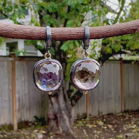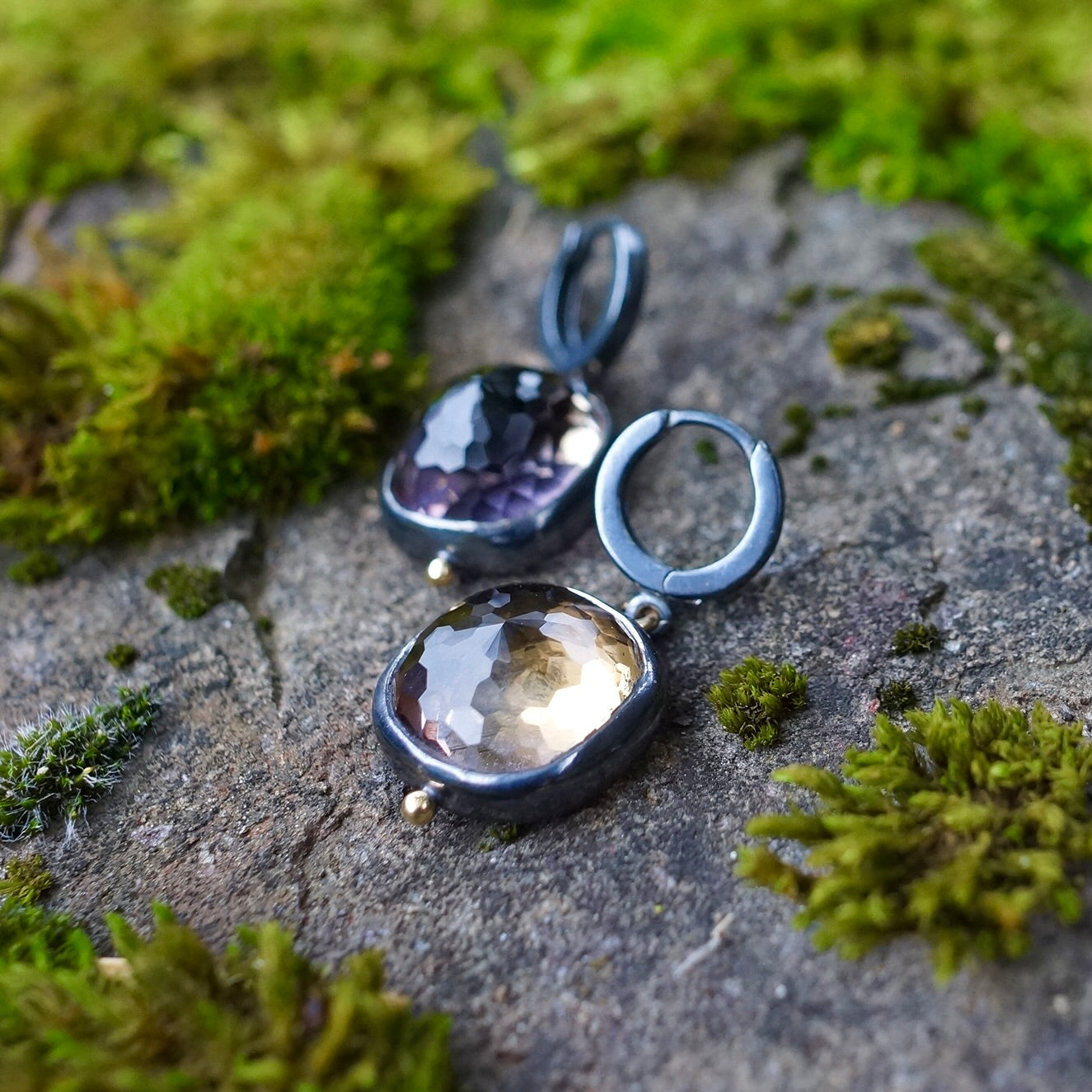 Ametrine is a very interesting stone. Two distinct color within a single crystal - purple and yellow (amethyst and citrine). The subtle pastel shades of these one are so pretty. High clarity gemstones with beautiful micro-faceting, which results in a lot of brilliance. Set in oxidized sterling silver with 18K gold accents and open backs. Earrings are 1 1/4" long, and each one weights 4 and 4.3gram.
