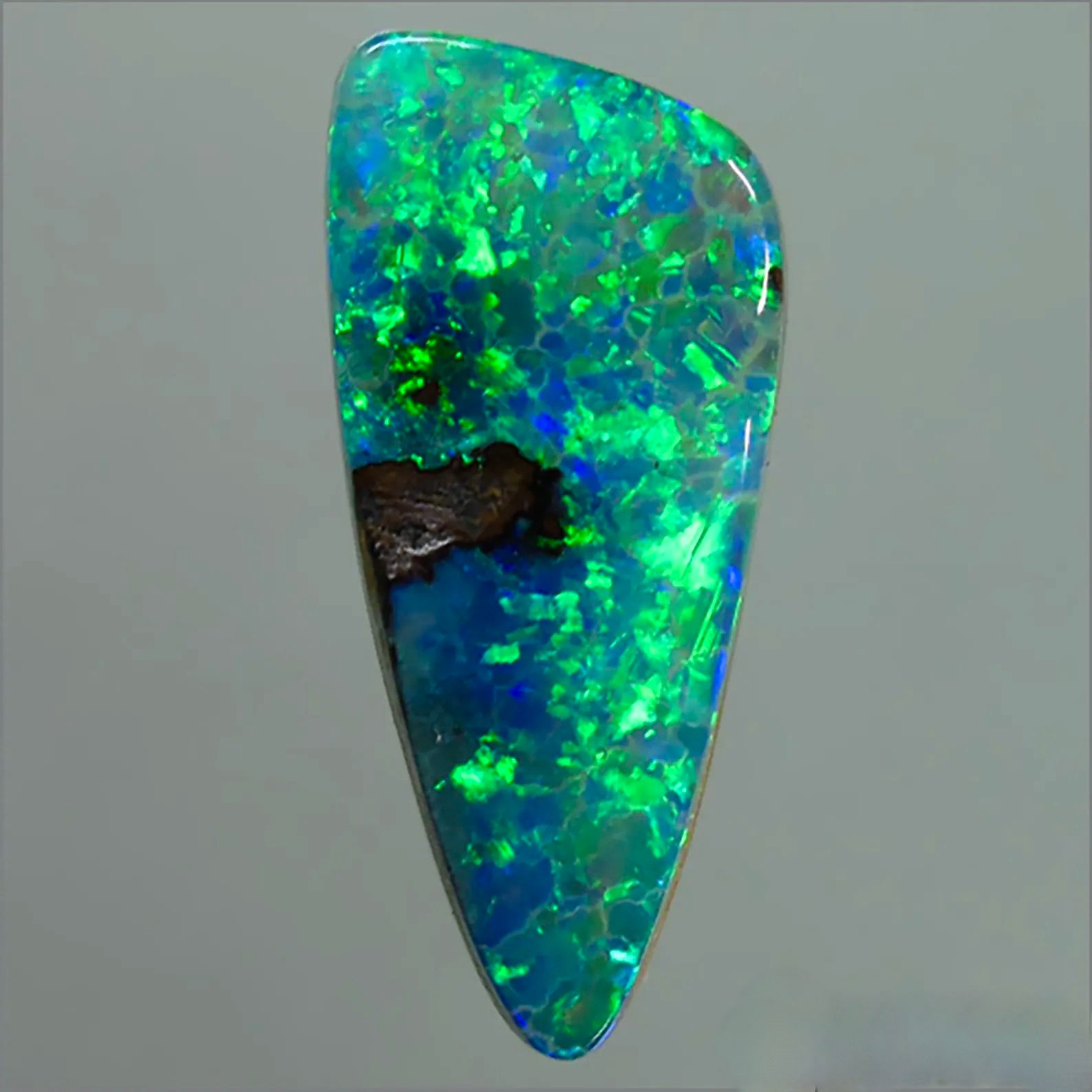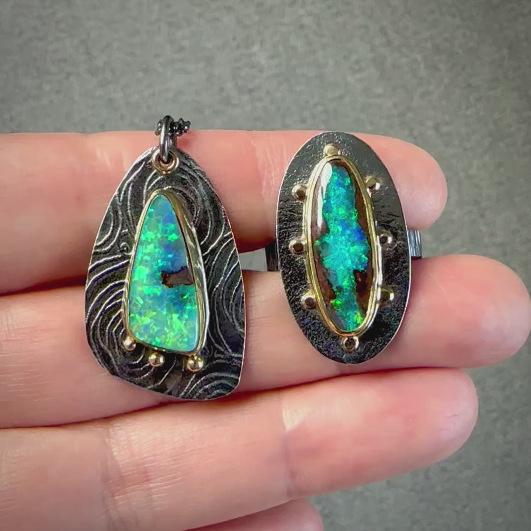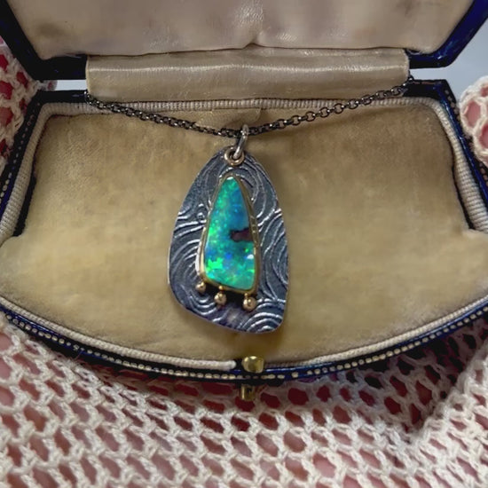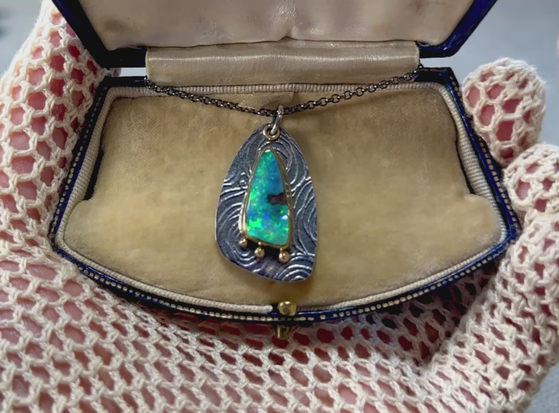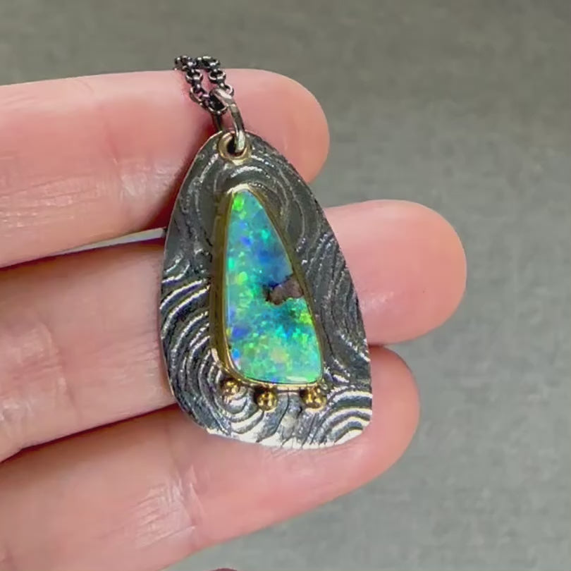 Here I have a flashy Australian boulder opal (20x8mm) from Queensland. Like other precious opals, it displays iridescent flashes of different colors, but the dark ironstone backing makes these colors appear more intense, almost like a black opal. It is offering a stunning depth, vibrant colors, contrast, and a durability of a host rock. I set this beauty in 22K gold bezel on top of textured silver backplate with 18K gold accents. Pendant measures 1 1/4 x 3/4" (not including the bail loop). Chain is 18" - optional (add on). Beautiful stone!