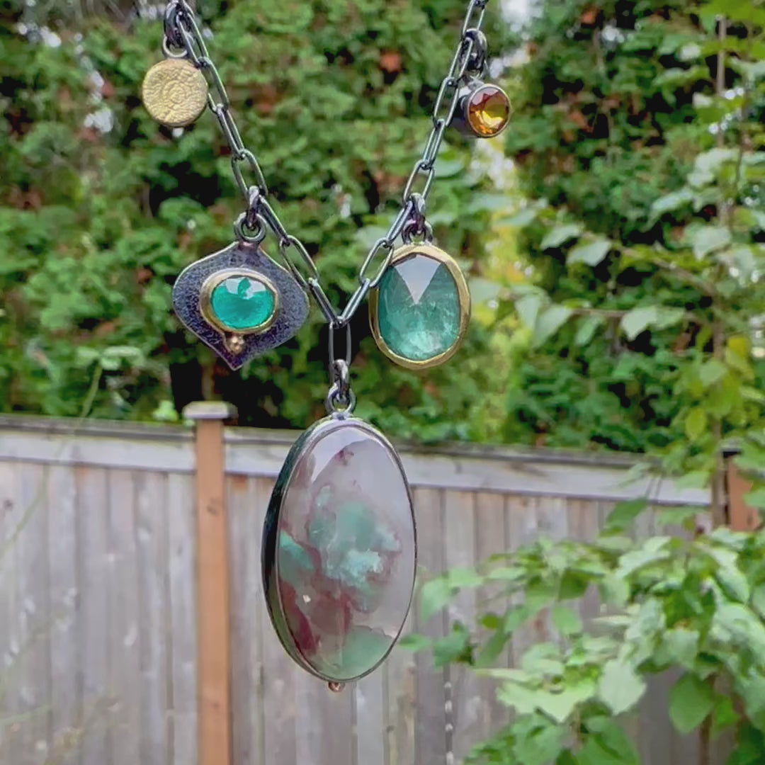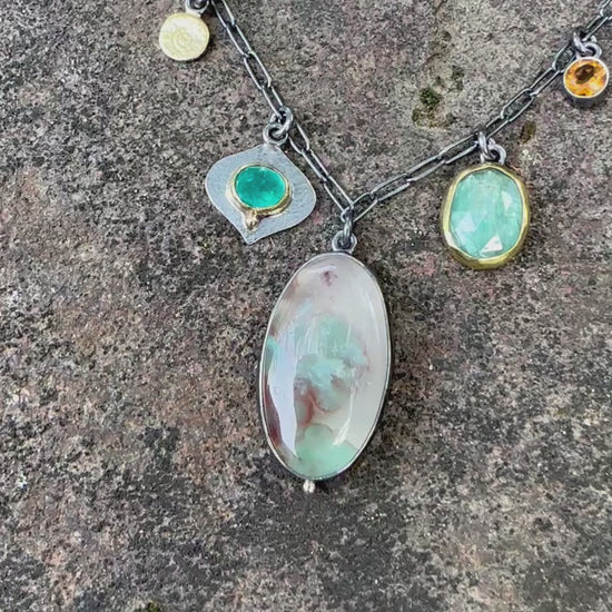 Autumn Necklace resembles a contrast of moodiness and vibrance of the fall season. To me Autumn is not just a season, it is a sensory experience that is both melancholic and rich with life. This necklace is made with natural and rare aquaprase, mint green kyanite, teal green apatite and golden citrine. Focal stone is aquaprase - a form of chalcedony with unique colors, natural inclusions, and soft translucency. Aqua blue and browns in translucent chalcedony - It is like a misty, foggy morning encouraging a sense of quiet and reflection. The accents stones are mint green kyanite and teal green apatite, both are set in 22k gold bezels. Other accents are 18K gold and 5mm faceted citrine. Aquaparse pendant measures 1 1/4 x 5/8". Necklace is 17-19" long, it is finished with gold filled clasp and and an extender with citrine brioltte.