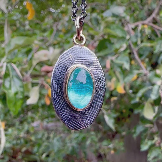 This blue apatite has a color of hidden laguna in a rainforest - vivid turquoise blue with beautiful clarity and a lot of brilliance. Gorgeous stone! The shape of the pendant is organic with raw edges. It's inspired by handmade Japanese stoneware where subtle imperfections come from a human touch - a reflection of the deep-seated cultural reverence for nature, and the passage of time. 13x9mm apatite is set in 22K gold bezel. Oxidized sterling silver with 18K gold bail. Pendant measures 1 x 5/8" (not including the bail). Chain is 18" - optional (add on).