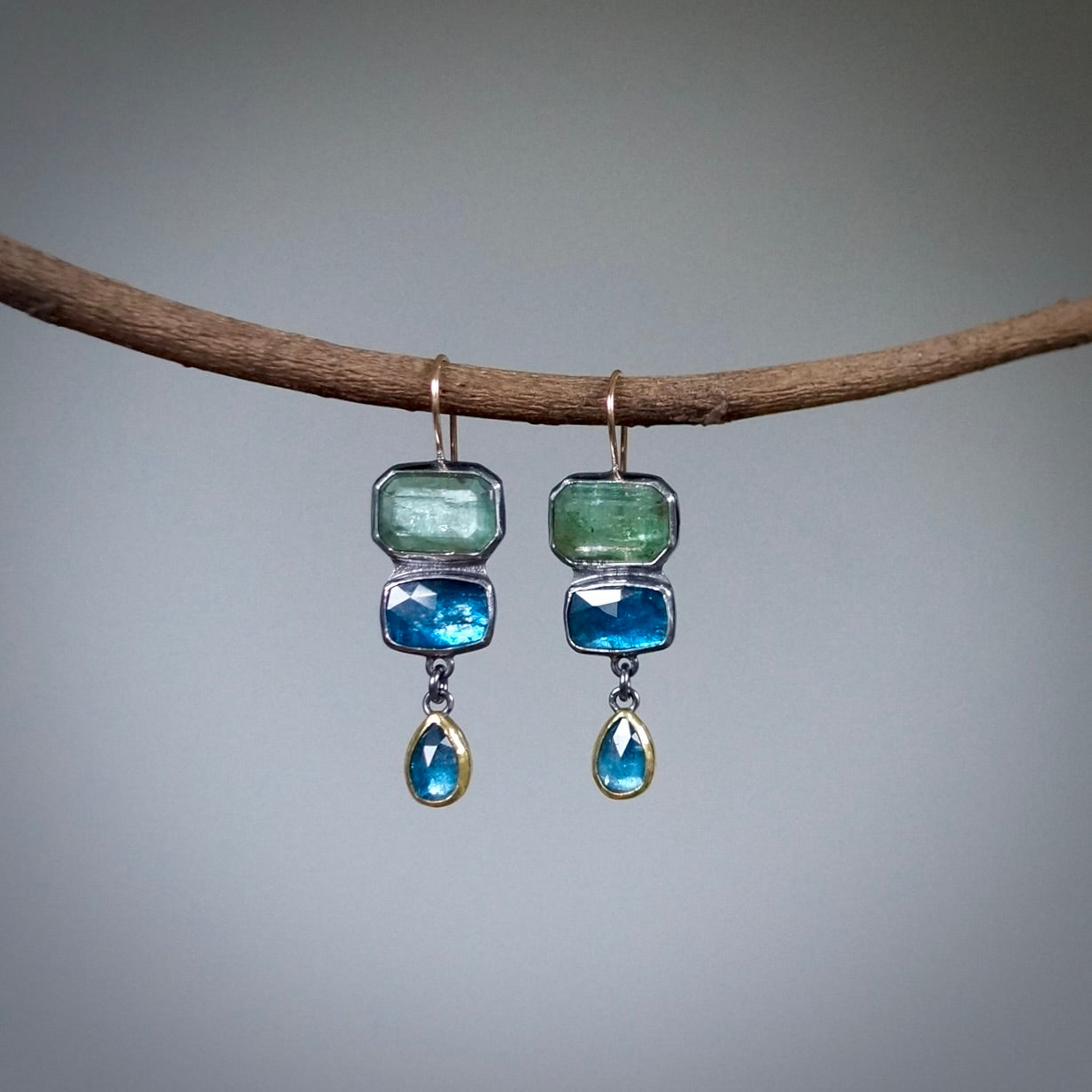 These blue green earrings are made with different shades of kyanite - teal blue, aqua blue and mint green. I love the color combination - it is very soothing yet bold at the same time. The teal blue kyanite has a neon hue to it and provides intensity and a nice contrast to more calming aqua blue and green colors. Set in oxidized sterling silver and 22K gold with solid 14K gold ear wires. Earrings are 2" long, and each one weights just under 5gram.