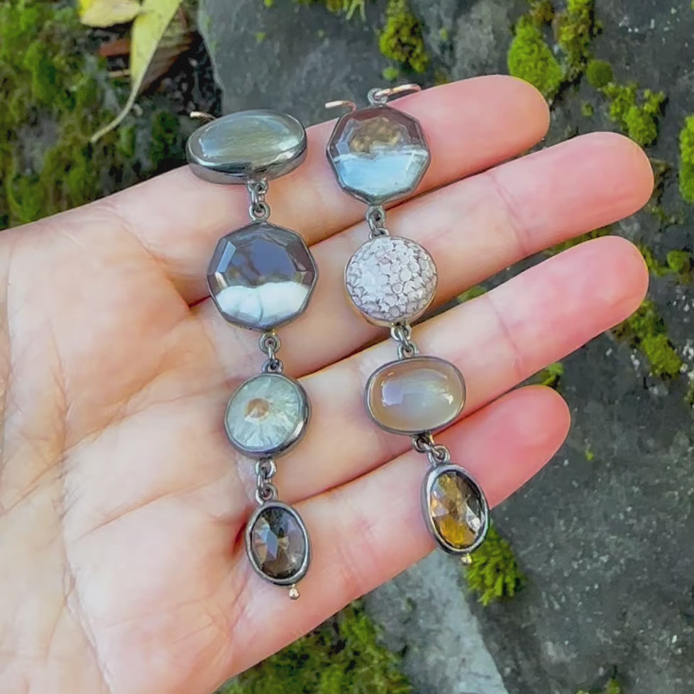 This pair gives a sense of serenity and calm. It reminds me of ocean waters on a gloomy overcast day. The neutral pallets of these is so attractive. The stones are Owyhee blue opal, smokey quartz, agate, green moonstone and snakeskin jasper. The jasper is set in 22K gold bezel. Other gold accents are 18K. The silver has been polished and oxidized. ear wires are gold filled. Earrings are 3.5" long, and each one weights 9 and 9.5gram.