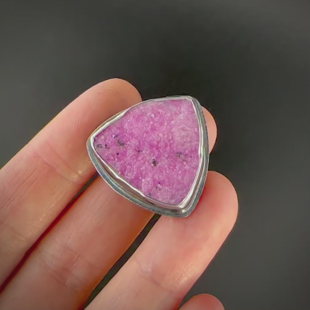 Gemstone: The pale rose color of cobalto calcite’s is contrasting beautifully with dark green malachite inclusions. As a druzy, it's covered in countless tiny, glittering crystal points, resembling sugar or frost, giving it incredible sparkle and shimmer. Gemstone measures 1 x 1"