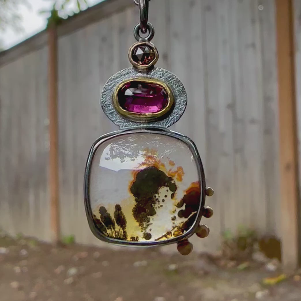 You can't go wrong with dendritic agate, rhodolite garnet and chocolate diamond combination :). This trio is striking and so good for Autumn! Agate is set in oxidized sterling silver with 18K gold accents (the back is open). Gem grade rhodolite garnet is set in 22K gold bezel, and 4mm chocolate rose cut diamond is set in 14K gold. Pendant measures 1 3/8 x 3/4" (excluding the bail loop). Chain is 18" - optional (add on).