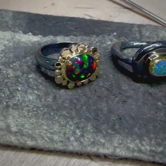 Material: Ethiopian black opal (smoked), 22K gold, 18K gold, sterling silver