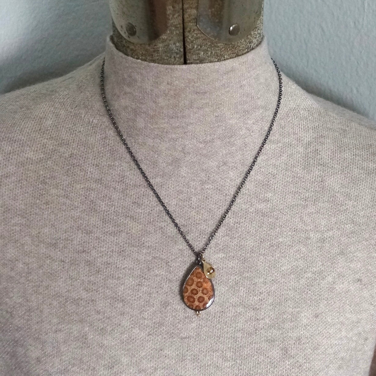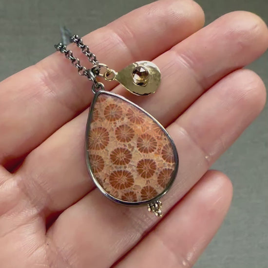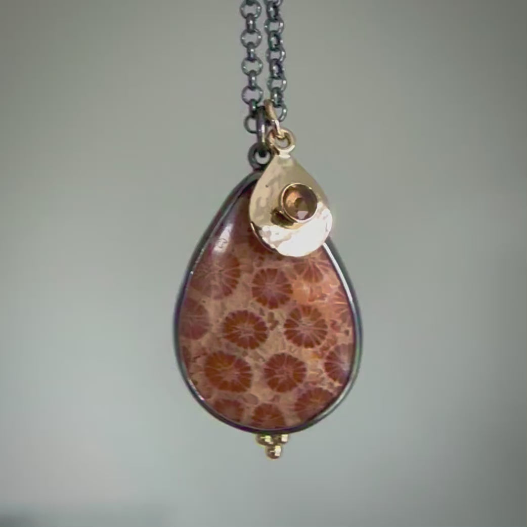 Flowering coral pendant with solid 18K gold orange sapphire charm. This fossilized coral with flower-like pattern is simply beautiful! The intricate patterns are not painted on but are the result of a natural process over millions of years that preserved its intricate structures within a colorful stone. I set this beauty in oxidized sterling silver with 18K gold granulation. The charm is made with solid 18K gold and 4mm rose cut orange sapphire. Coral pendant measures 1 12/ x 7/8" (excluding the bail loop). Chain is 18" - included.
