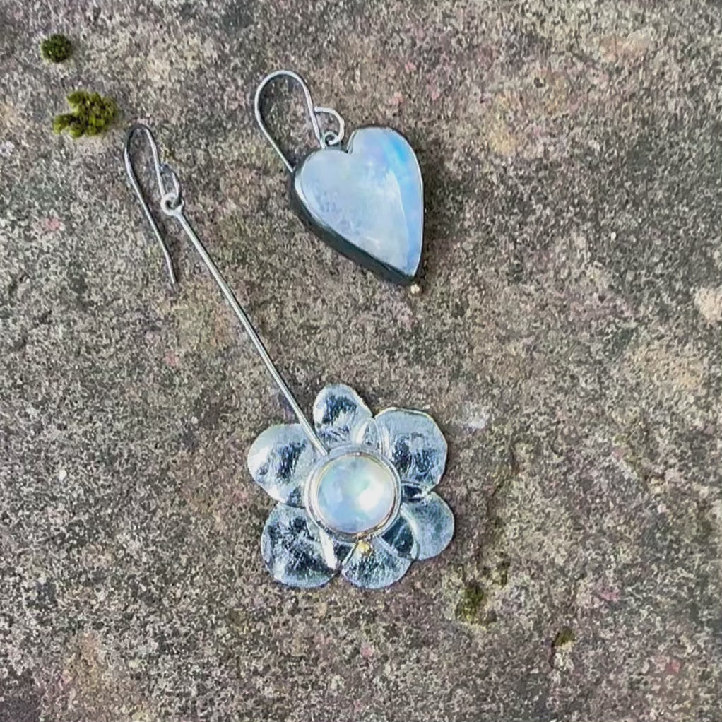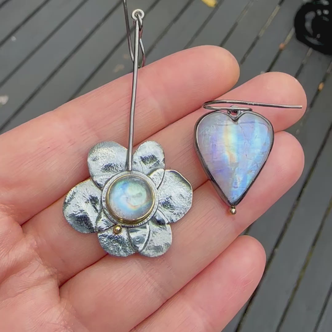 Revisiting an old design with these Hearts & Flowers earrings. Rainbow moonstone, oxidized sterling silver and 22K gold. Playful asymmetrical design. Earrings are almost 3" long (the flower one), and each one weights 5.9 and 4.5 gram. So much personality in this pair!