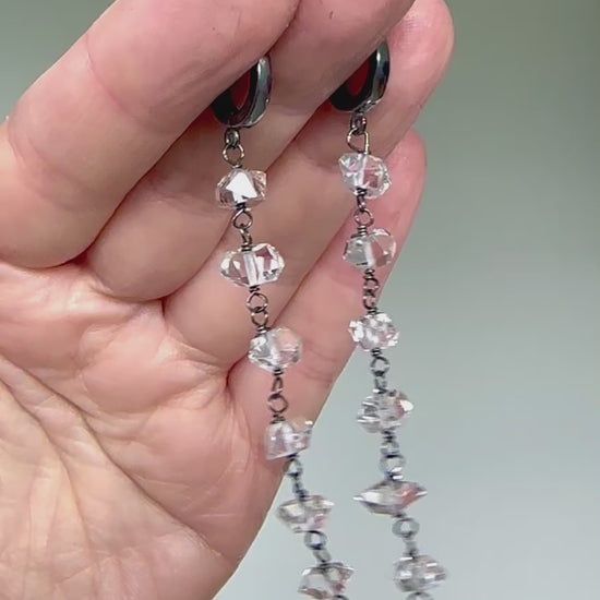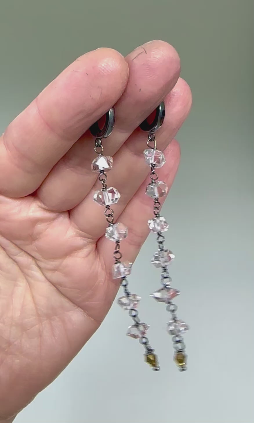Oxidized sterling silver and gold vermeil with natural high grade Herkimer diamond quartz gemstones. Earrings are 3 1/4" long, and each one weights 2.8 gram.