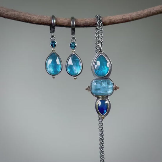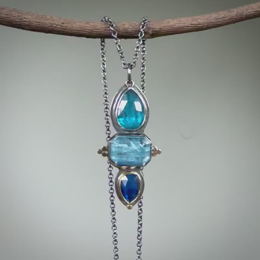 Kyanite Trio pendant is made with three different shades kyanites - teal blue, aqua blue and cobalt blue. The different shades create depth and dimension, with lighter pieces offering a serene, airy feel like "flying in the sky," while deeper, darker one provides contrast and intensity. Set in oxidized sterling silver. The small cobalt blue kyanite is set in 22K gold bezel. Other gold accents are 18K gold. Pendant measures 1 3/4 x 7/8" (excluding the bail loop). Chain is 18" - optional (add on).