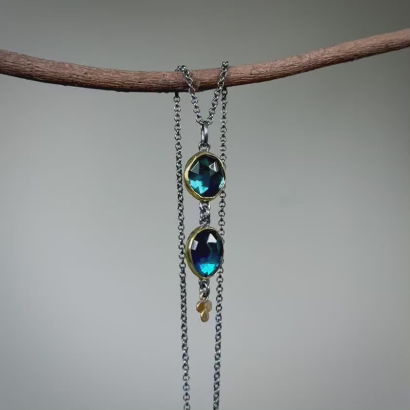 The deep inky blue color of London blue topaz evokes the mystery of twilight sky. This shade of blue is darker and more intense than other blue topaz varieties, and it is my absolute favorite. It is very elegant! The high clarity and the rose cut also makes the color pop. Set in 22K gold bezels with silver backing. The little gold charm at the bottom is solid 18K gold. Pendant measures 1 7/8 x 1/2" (not including the bail loop). Chain is 18" - optional (add on).