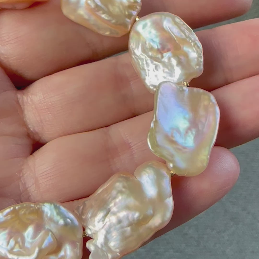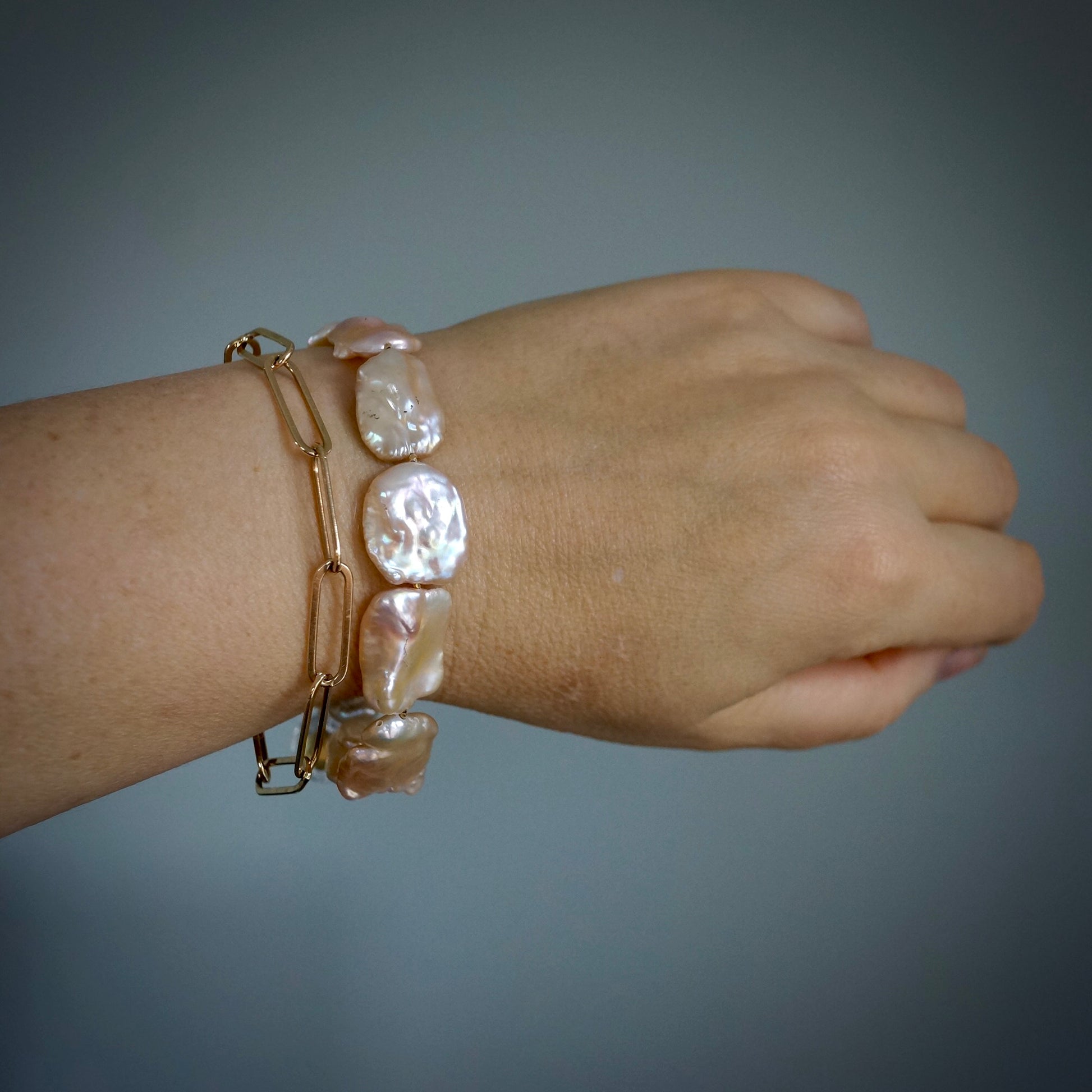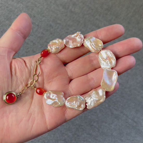 This pretty bracelet is made with natural keshi pearls, and these are just spectacular! Not dyed, natural rainbow pearls with metallic luster. This set of keshi pearls is relatively large in size and relatively rare, their colors and shapes are also beautiful. Accented with natural carnelian and gold filled clasp and extender. The charm is natural carnelian set in 22K gold bezel with 18K gold/sterling silver backplate. I made this bracelet larger than a standard size, so I am happy to make it smaller if needed (or larger). Right now it is 8.5 - 9.5" long, let me know if you need it adjusted. Enjoy!