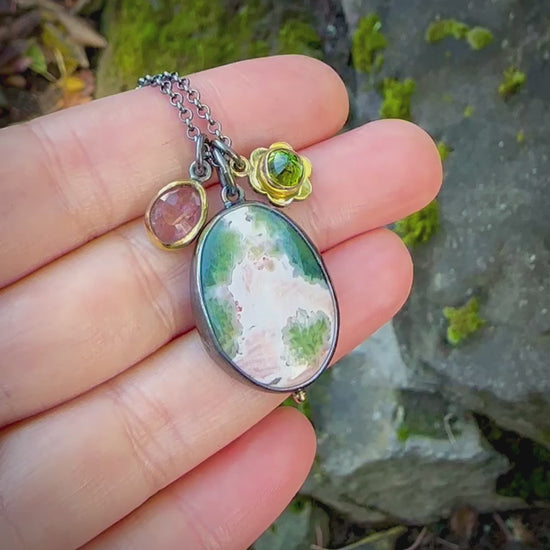 Translucent green splashes agains the pink background in this beautiful ocean jasper. Soft palette with romantic pattern is so pleasing to the eye. Accent stones are gem grade green tourmaline (set in 18K gold and bi-metal) and pink tourmaline (set in 22K gold bezel). The silver has been oxidized. Jasper pendant measures 1 1/8 x 3/4". Necklace is 18" (included). Beautiful!
