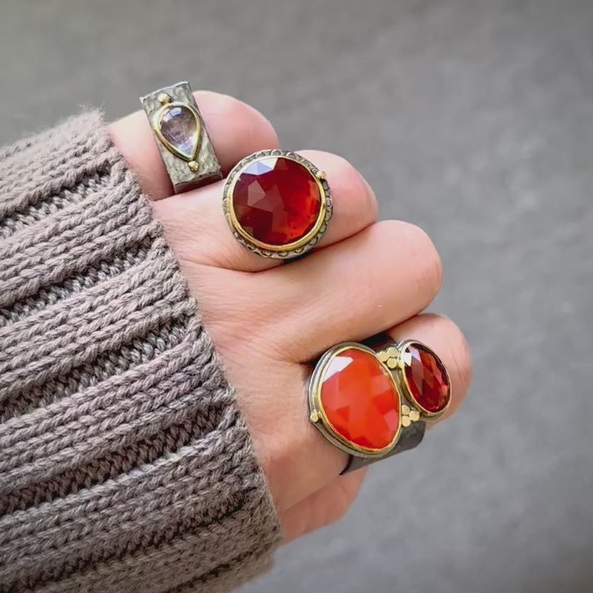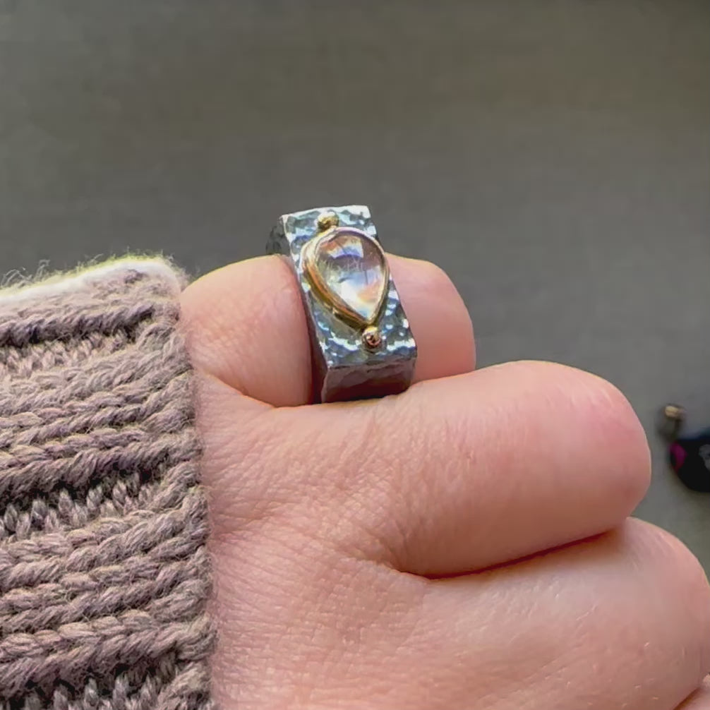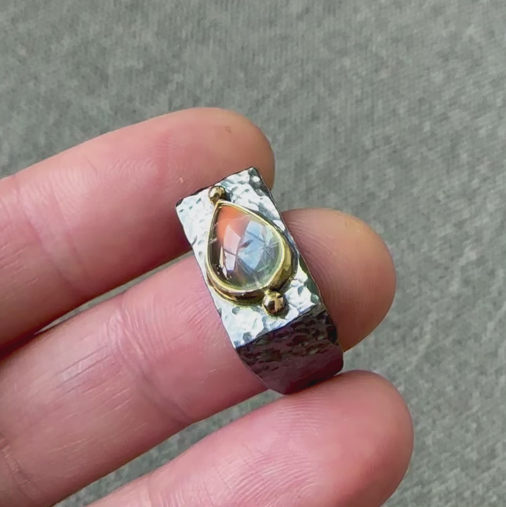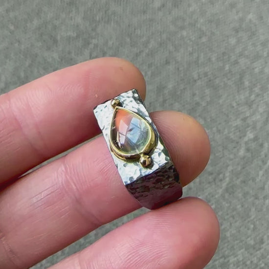 This gem grade rainbow moonstone has the highest clarity and the most vibrant colors! The colors flash across the surface, but also appear to be inside the stone. It is like prism of light and color, just beautiful! The ring is a signet style, solid (not hollow) hammered ring with nice weight to it. The stone is set in 22K gold bezel with 18K gold accents. I love the contrast between the brilliance of the stone and the dark silver. Gold also stands out against the patina so well. Ring's face measures 11/16x3/8". Size 6 on mandrel.