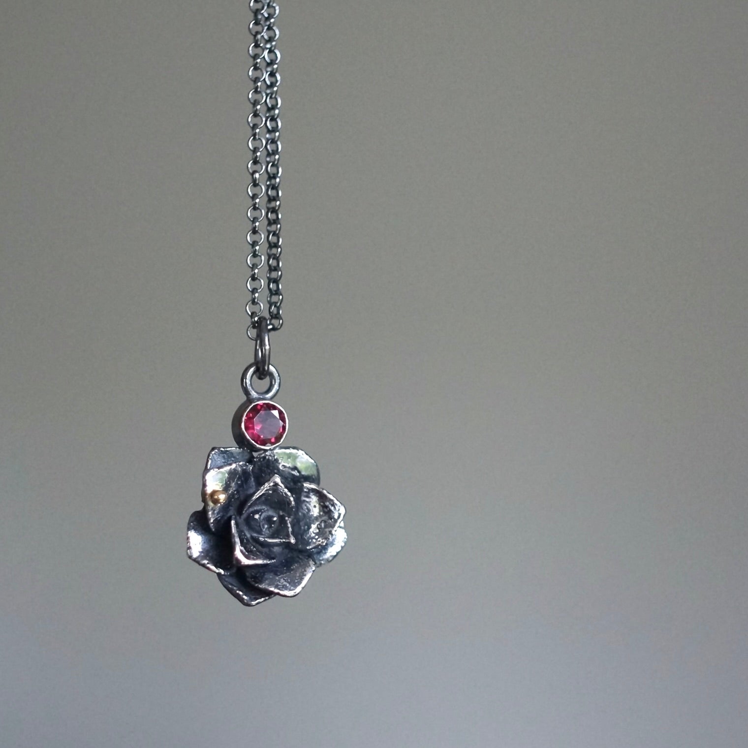 This one is so cute! A perfect gift for someone who loves to garden. Cast sterling silver succulent accented with 5mm faceted rhodolite garnet and just a touch of 18K gold. Pendant has a nice weight to it because it is solid. Pendant measures 1x3/4" (excluding the bail loop). Chain is 18" - optional (add on).