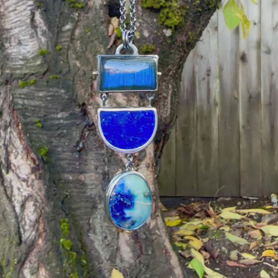 The Royal Blue Trio pendant is made with gem grade labradorite, lapis lazuli and afghanite. The deep celestial blue colors in this one, the pyrite flecks, the effect of a night sky - it all creates a royal feel, and at the same time, a sense of being grounded. Set in oxidized sterling silver with 18K gold accents. Pendant measures 2 5/8 x 1" (not including the bail loops). Chain is 18" - optional (add on).