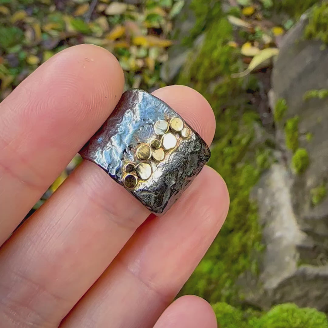 This rustic sterling silver band is made by fusing silver and creating a unique organic texture while the silver is in almost liquid form. It is basically hand sculpted under high heat. It's been sanded and polished to a smooth finish and it feels really good on the finger. The accent dots are solid 18K gold. Size - this ring fits to finger size 6 (it is 6.75 on mandrel, but fits smaller due to the wide band). One of a kind.