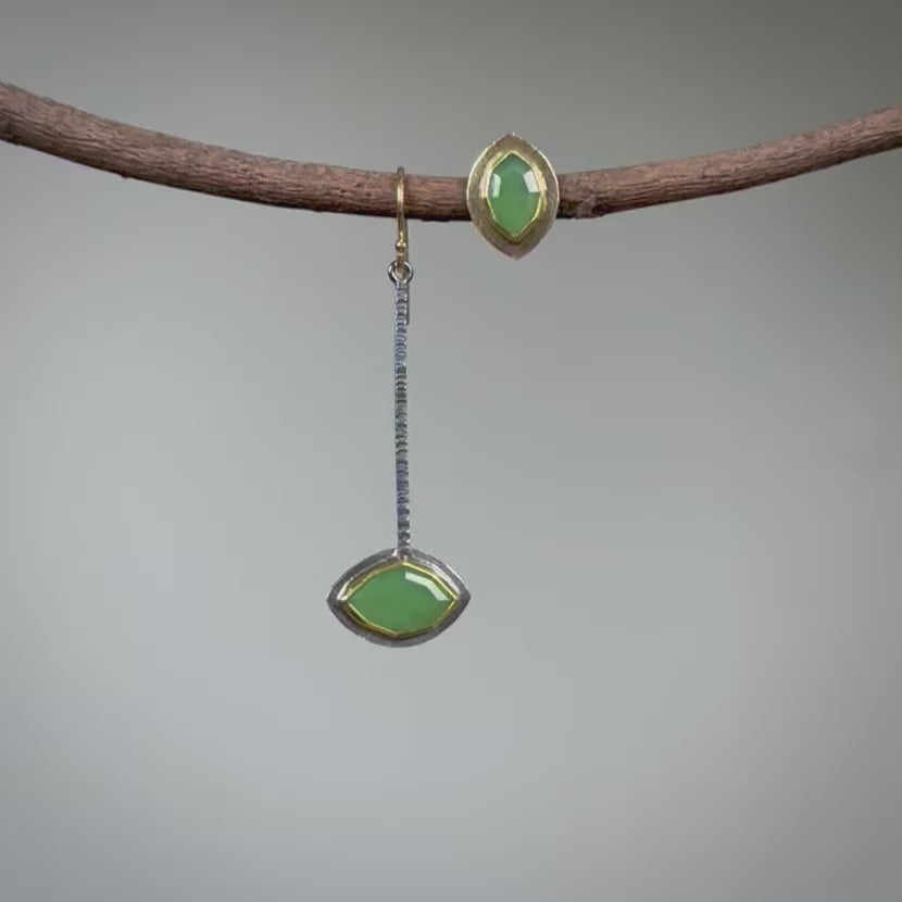 Asymmetrical jade earrings. This Wyoming Apple green jade has soft smooth and translucent texture and beautiful apple green color. The color is very soothing, no wonder jade is considered a stone of purity and serenity, promoting peace and harmony. I love the geometrical cut as well. Wyoming jade is exceptionally tough, more durable than granite, and takes a high, glassy polish, which enhances its natural beauty. Set in 22K gold bezels with oxidized sterling silver backplate (long earrings) and 18K gold bimetal backplate (stud earring). Earrings are 2 1/2" long (the longer one) and each one weights 2 and 2.8 gram. The long earring has gold filled ear wire.