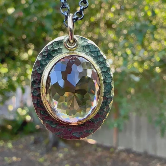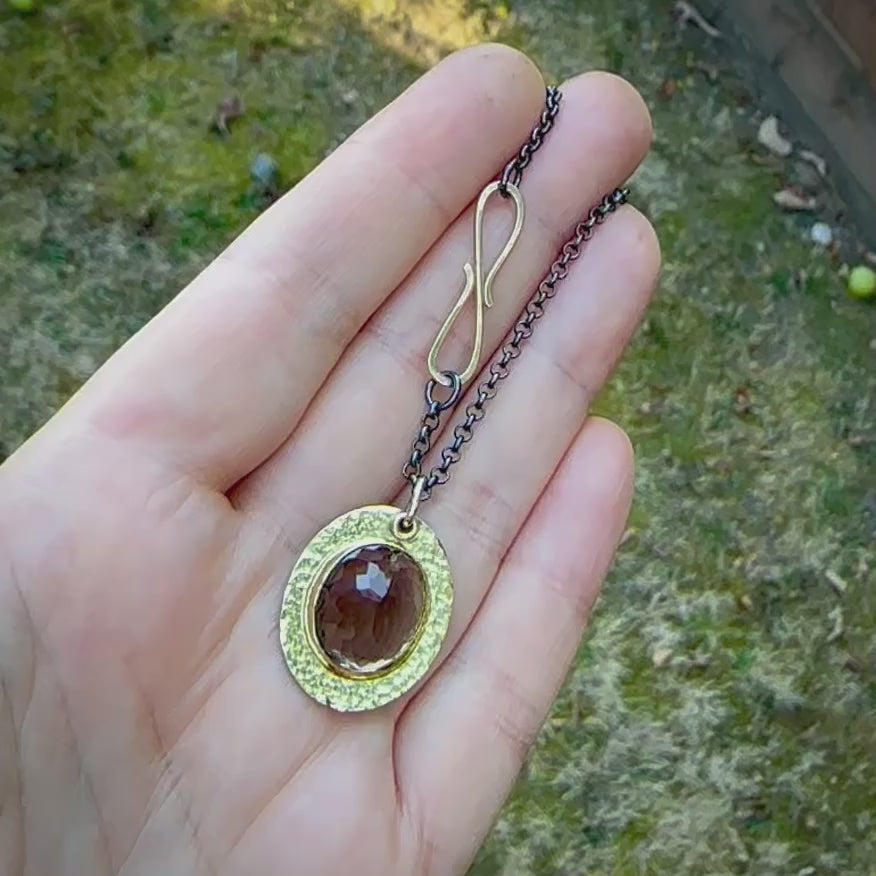 This smokey quartz possess excellent clarity and a brilliant luster, allowing light to beautifully interact with its earthy tones. Micro-facated high dome stone with lots of sparkle, I set in with the back open. Set in 22K gold bezel on top of hand hammered 18K gold bi-metal backplate. 14K gold bail. Pendant measures 1 x 3/4". Chain with gold hook clasp is sold individually.
