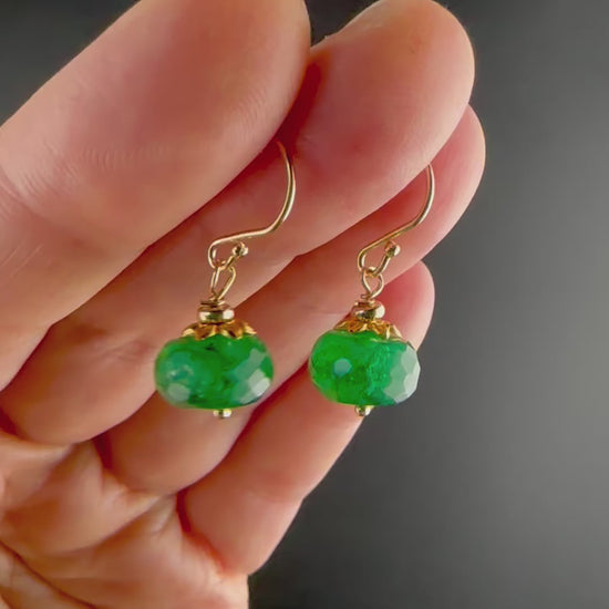 Natural faceted emerald with solid 18K gold accent beads and solid 14K gold ear wires. accent beads are faceted green quartz. Super light weight. Earrings are 1" long, each one weights 1.7gram. Gorgeous green!