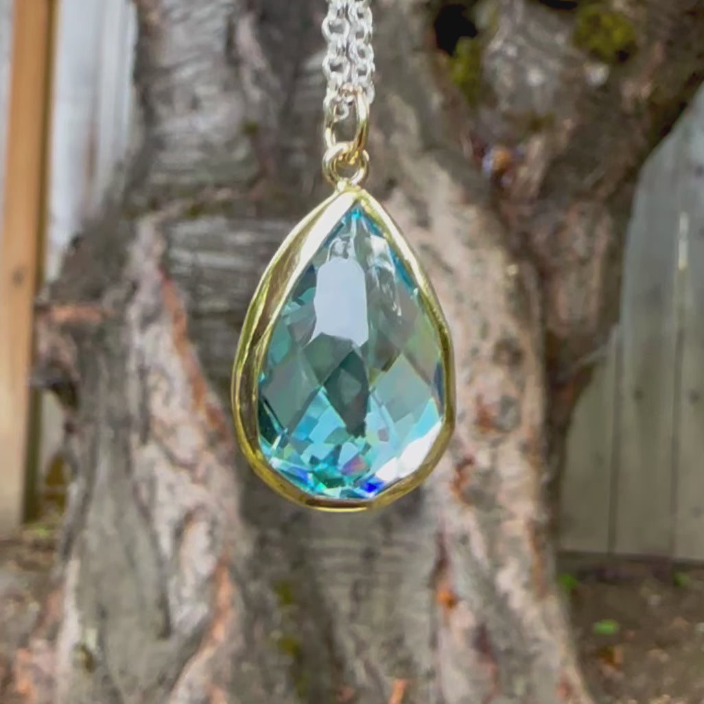 This faceted Swiss blue topaz is fire! Its vivid, electric azure hue captures the essence of a tranquil summer day, a color that is both bright and endlessly calming. Set in 22k gold bezel with 18K gold bail. The back of the pendant is open. This pendant is reversible - it can be worn either side up. Really beautiful cut on both sides. The stone 21x14mm in size and 18.5ct. in weight. Chain is 18" - optional (add on).