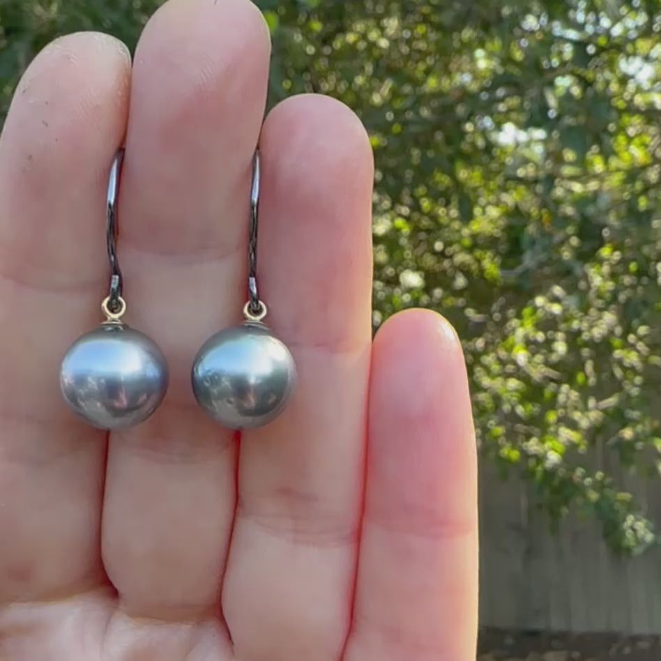 High grade natural Tahitian pearls with 14K gold pegs and oxidized sterling silver ear wires. They exuded sophistication and mystery and display high luster. Light grey color is so elegant. Pearls measures 12mm in size. earrings are 1 1/8" long. Each one weights 2.5 gram.