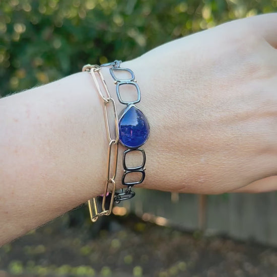 Beautiful velvety blue with violet hues tanzanite is set in oxidized sterling silver with 18K gold accents. The stone measures 3/4 x 5/8". Rhodolite garnet charm. Bracelet is 6 1/2 - 7 3/4" long.