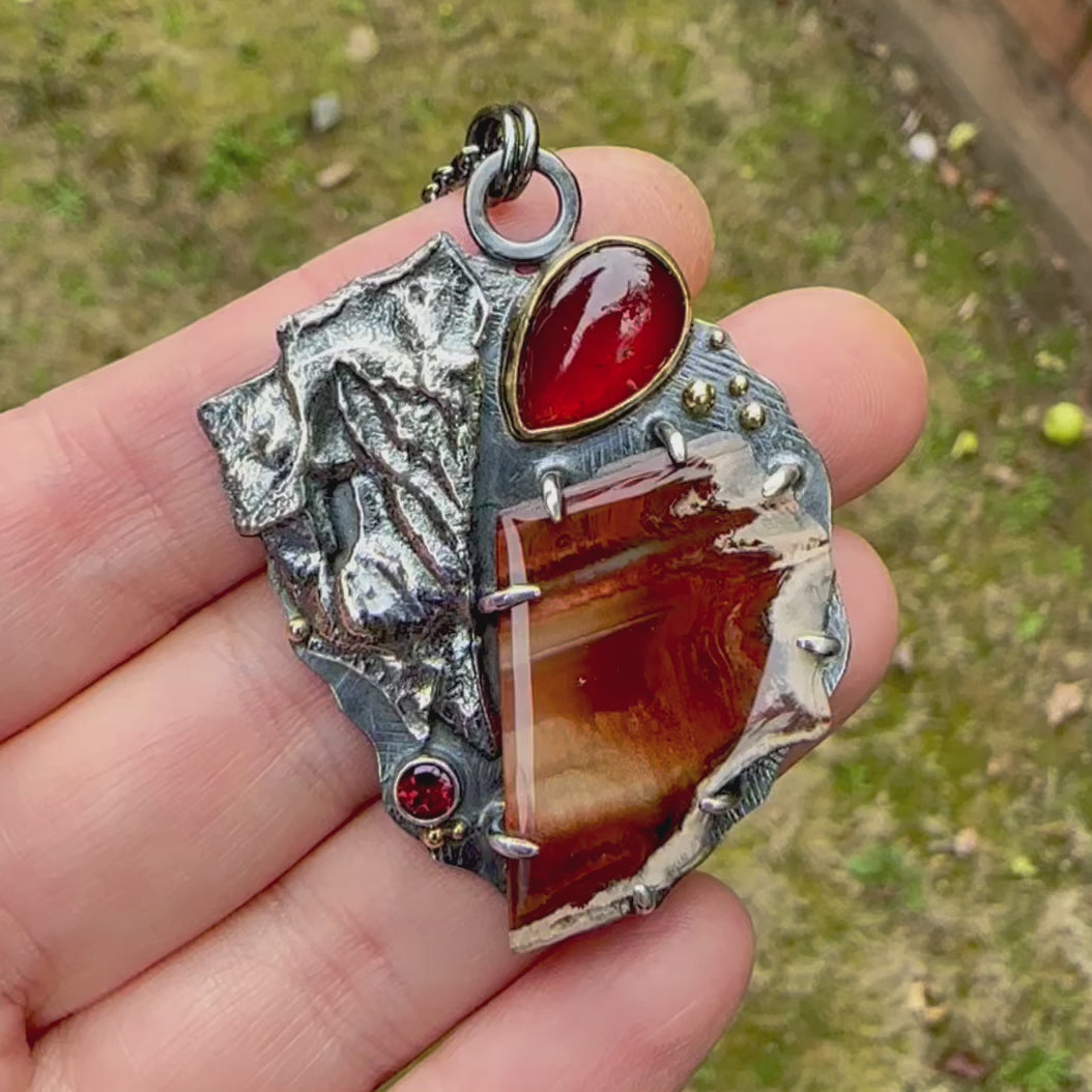Transformation pendant is made with raw edge agate (Indonesia), garnet and sculpted fused silver. The sculpted bit is made by melting and fusing bits of silver and sculpting it white is hot and pliable. Each sculpted piece is completely unique and impossible to re-create. Hessoniote garnet teardrop is set in 22K gold bezel. The granulation is 18K gold. Pendant measures 2 1/8 x 1 3/4" (excluding the bail loops). Chain is 18" - optional (add on).